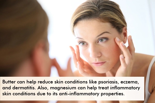 버터에 함유된 마그네슘은 항염 특성으로 인해 염증성 피부 질환을 치료하는 데 유용할 수 있으며, 피부의 자극, 부기 및 발적을 감소시킬 수 있습니다.