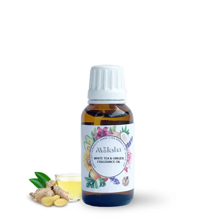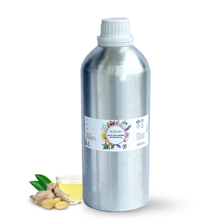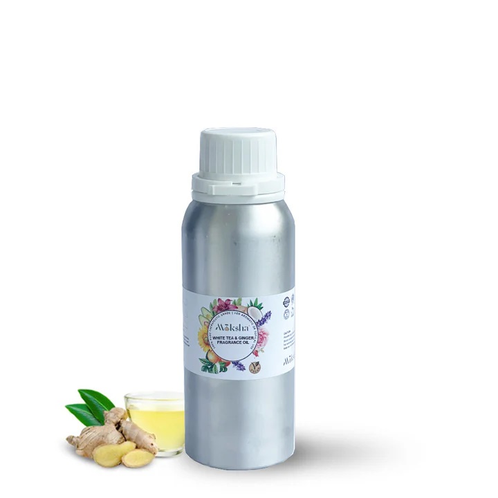 Moksha의 화이트 티 앤 진저 프래그런스 오일은 30ml, 100ml, 250ml, 1리터부터 다양한 팩 크기로 제공됩니다.