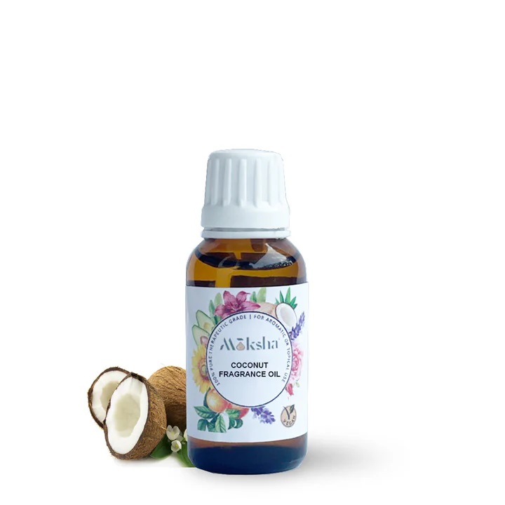 Moksha의 코코넛 프래그런스 오일은 30ml, 100ml, 250ml, 1리터부터 다양한 팩 크기로 제공됩니다.