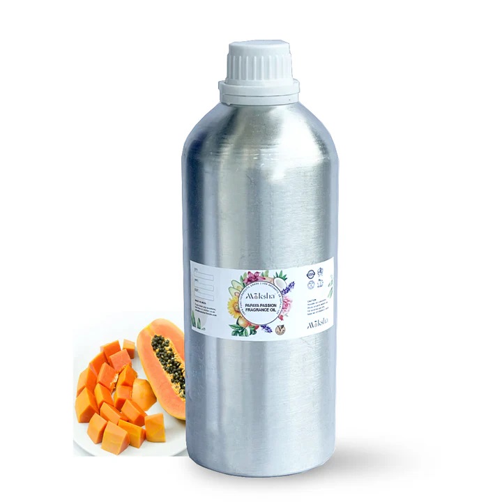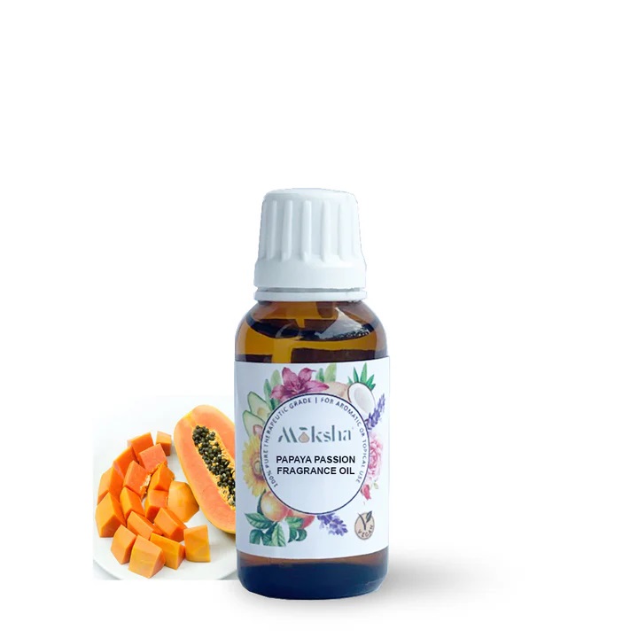 Moksha의 파파야 패션 프래그런스 오일은 30ml, 100ml, 250ml, 1리터부터 다양한 팩 크기로 제공됩니다.